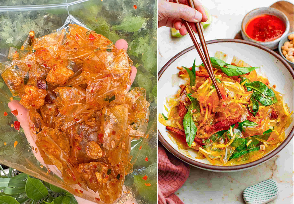 Nếu bánh tráng phơi sương mang đậm nét truyền thống, thì bánh tráng trộn lại là phiên bản hiện đại, được giới trẻ đặc biệt yêu thích. Bánh tráng được cắt nhỏ, trộn cùng tôm khô, đậu phộng, hành phi, muối ớt Tây Ninh, và đôi khi là xoài xanh hoặc trứng cút. Điểm nhấn chính là muối ớt Tây Ninh – loại muối đặc trưng với vị cay nồng, mặn mà, được làm từ ớt tươi và muối hạt rang kỹ lưỡng. Chỉ cần trộn đều, bạn đã có một bịch bánh tráng trộn thơm lừng, đầy màu sắc.